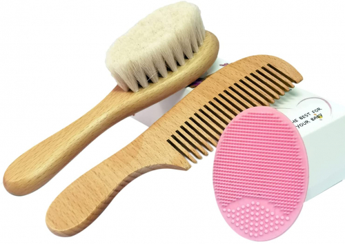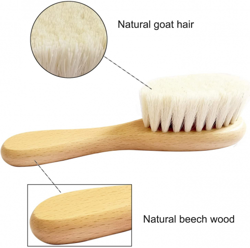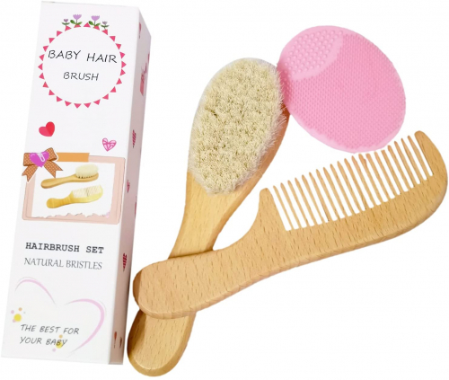 3pcs Cepillo de pelo de bebé & Conjunto de peine - Cepillo de cerdas de cabra y cepillo de pelo de silicona para el tratamiento de la costra láctea Cepillo de cerdas de madera para recién nacidos - Mocarheri