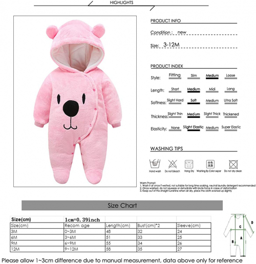 bebé recién Nacido niños niñas Franela Sudadera con Capucha Mameluco del oído Invierno cálido Mono Monos Ropa de Dormir Rosado 6-9 meses - puseky