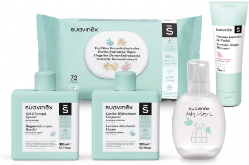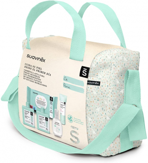 Bolso de Cosmética Suavinex Gel-Champú Syndet 300Ml + Loción Hidratante 300ML + Pomada Intensiva de Pañal 75Ml + Nueva Baby Cologne 100Ml + Toallitas Dermohidratantes 72Ud - 5 Productos, Verde - SUAVINEX