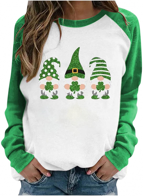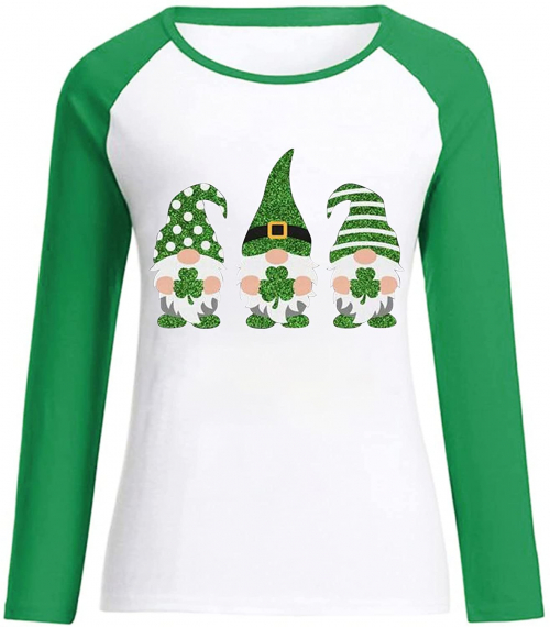 Women St. Patrick's Day Green Shirts GNOME Shamrock Print Long Sleeve tee Clover Graphic Tops Casual Blouse L #01 - STARWAVE