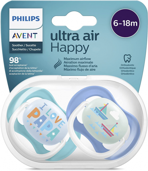 Scf 080/03 - 6-18 Meses, Tetina Blanda, color Azul Y Turquesa - Pack de 2, Paquete De 2 Chupetes Ultra Air - Philips Avent